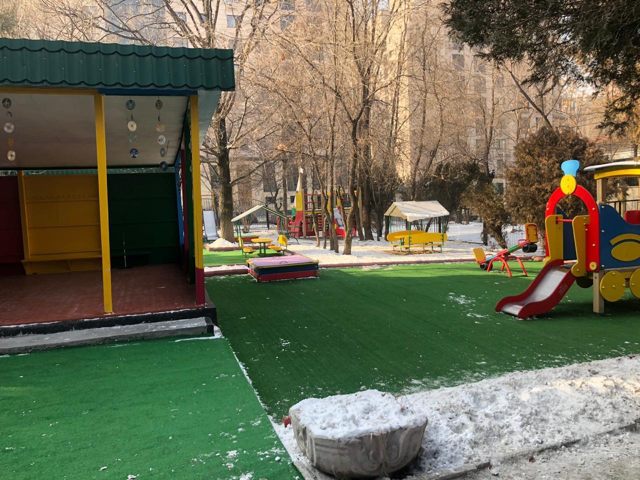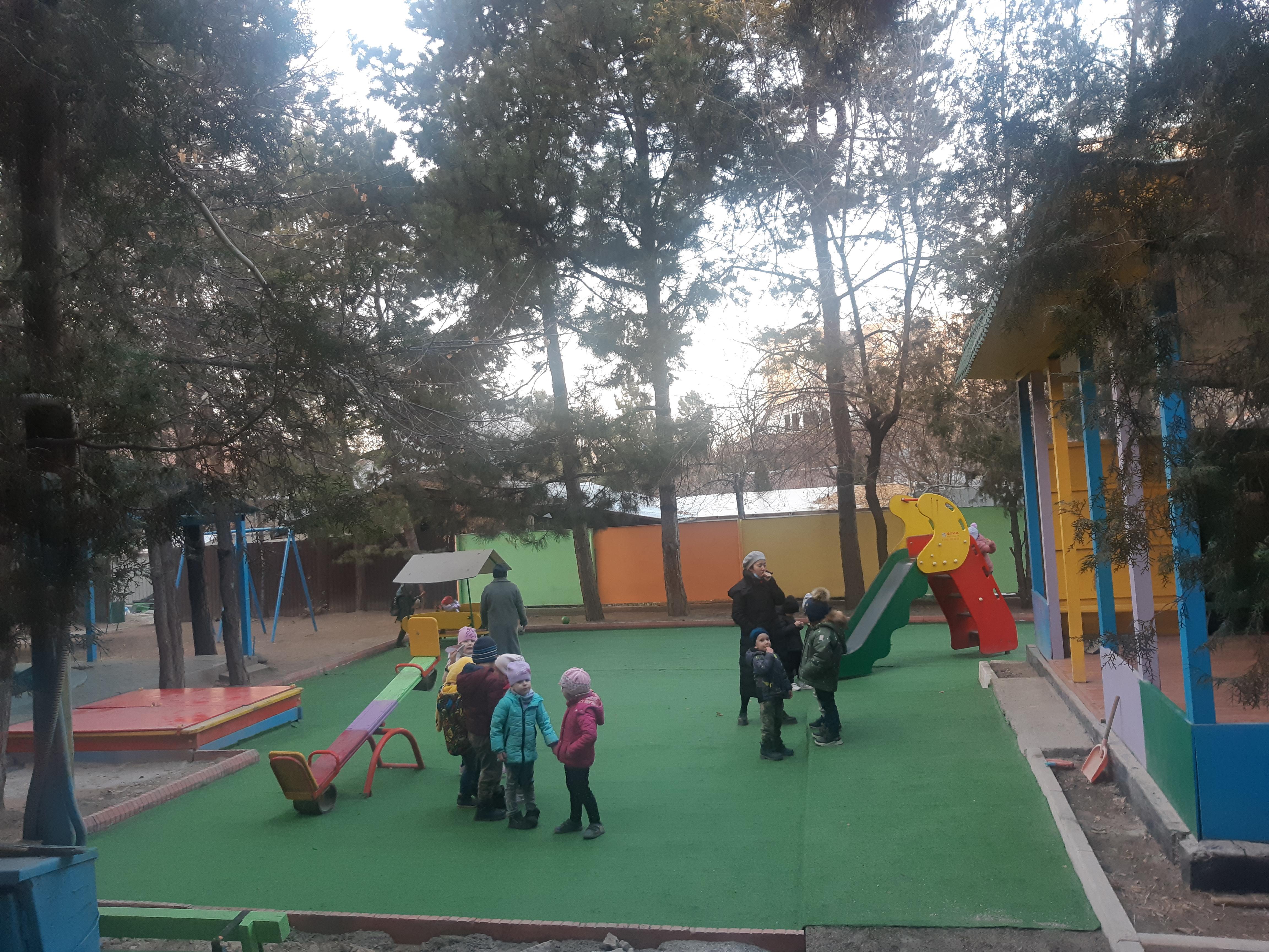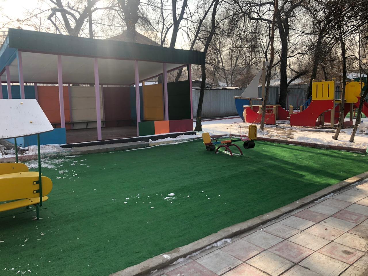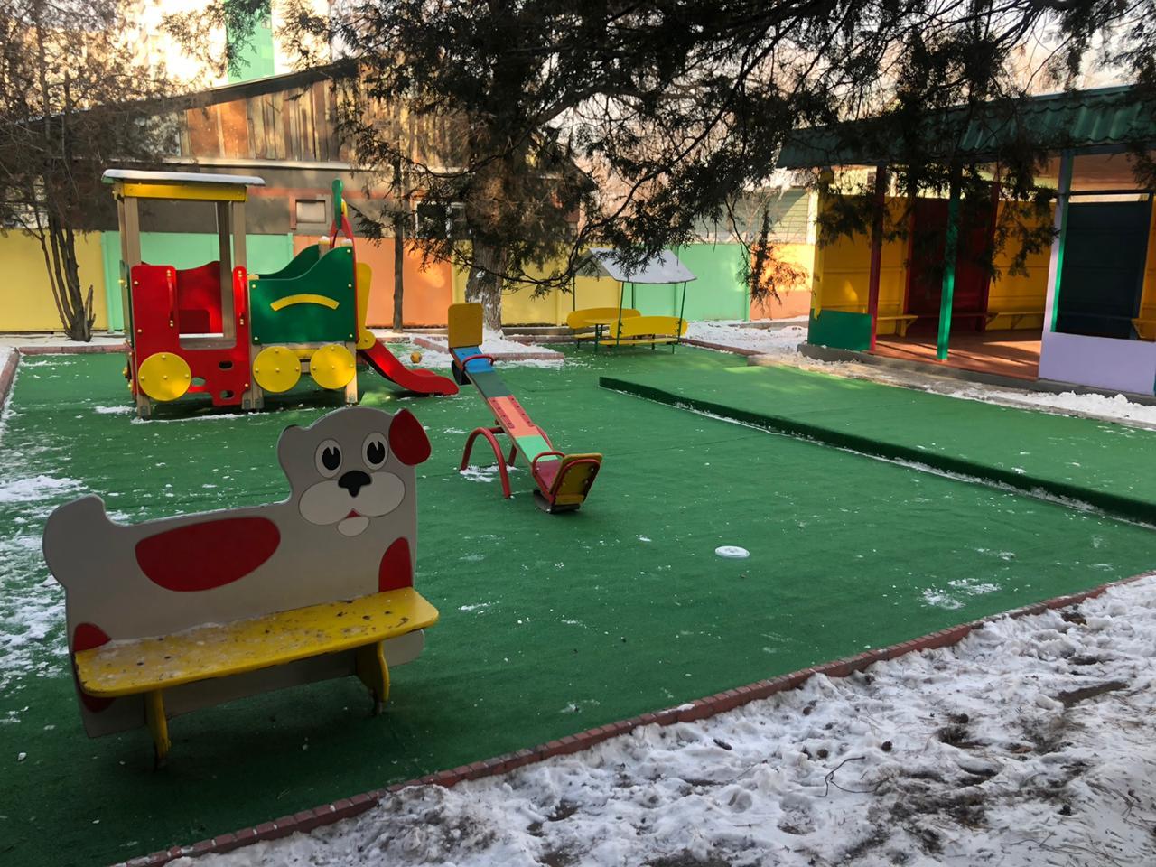 Территория детского сада огорожена решетчатым забором высотой 1 метр и в темное время суток освещается мощными фонарями дневного света.