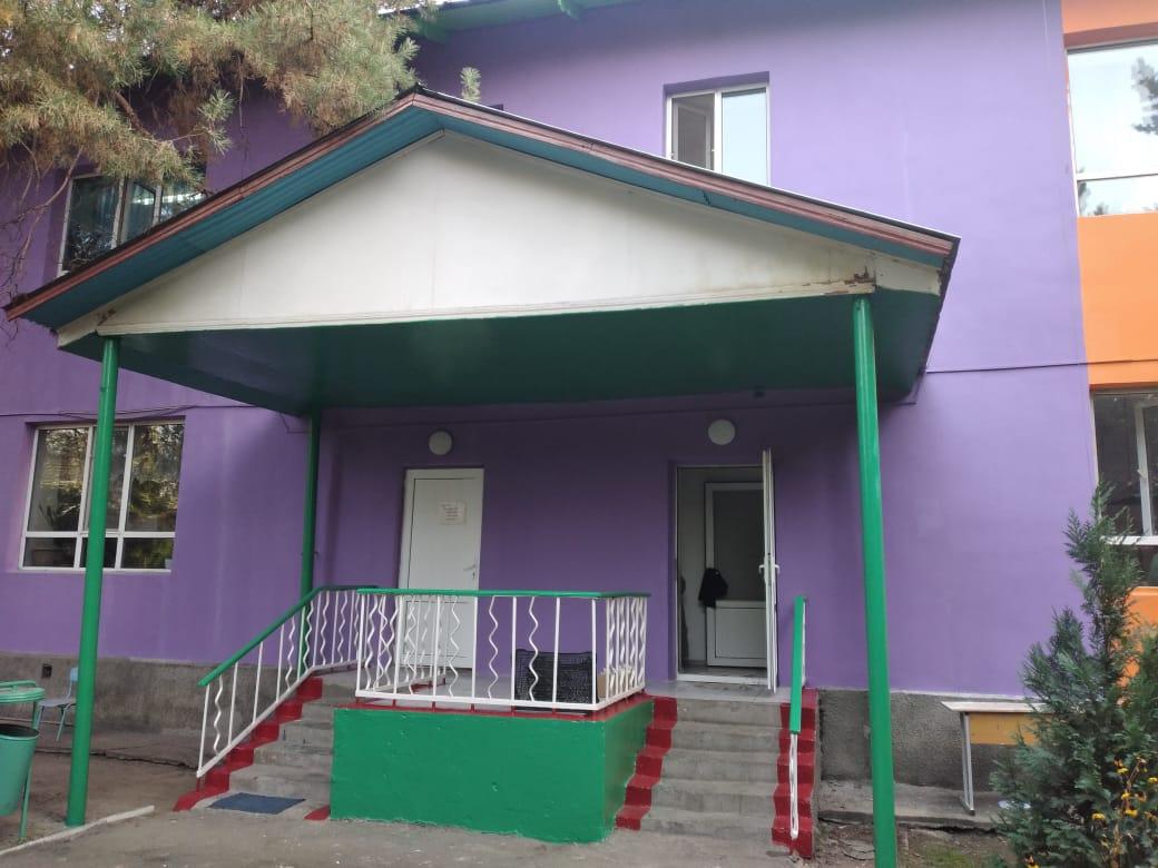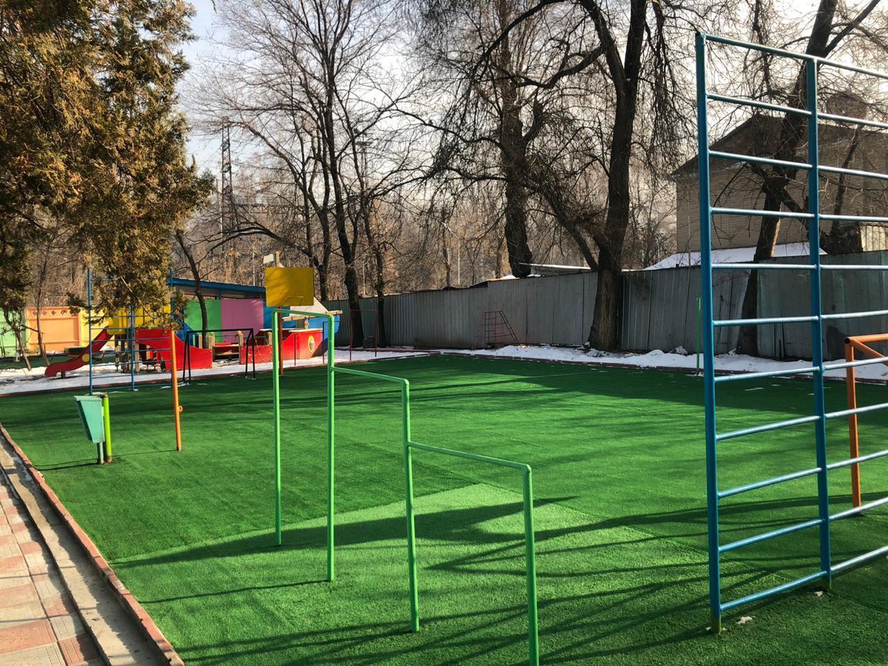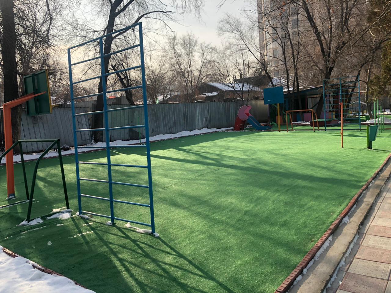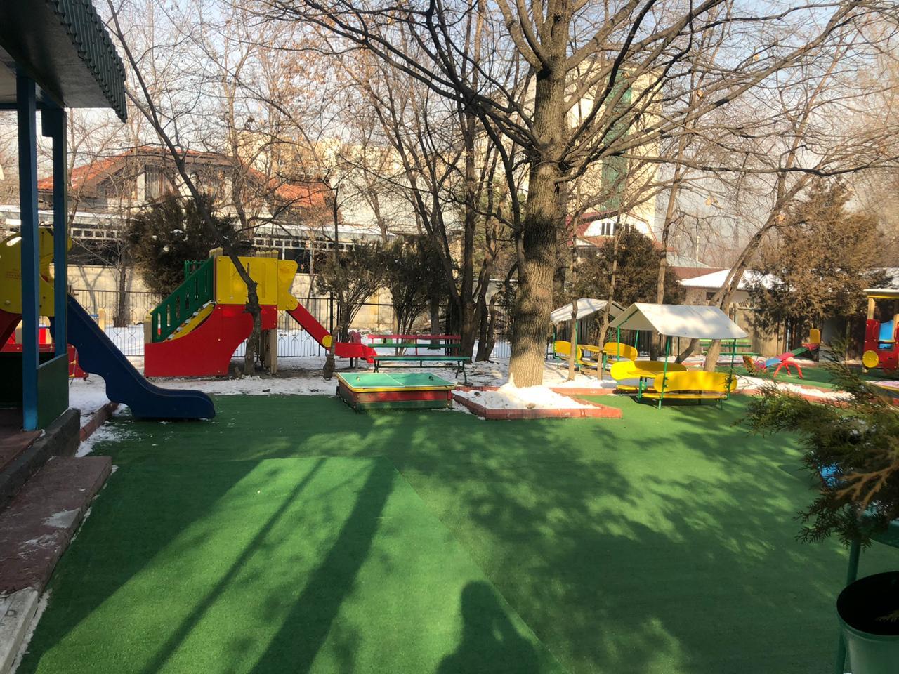 Территория детского сада огорожена решетчатым забором высотой 1 метр и в темное время суток освещается мощными фонарями дневного света.