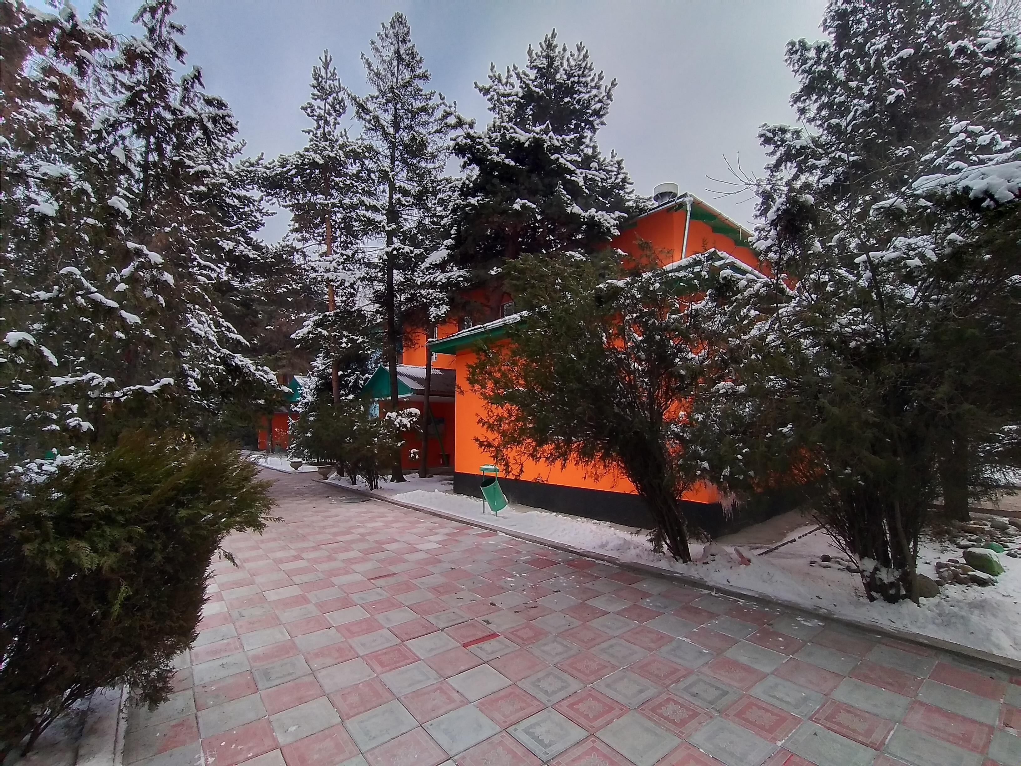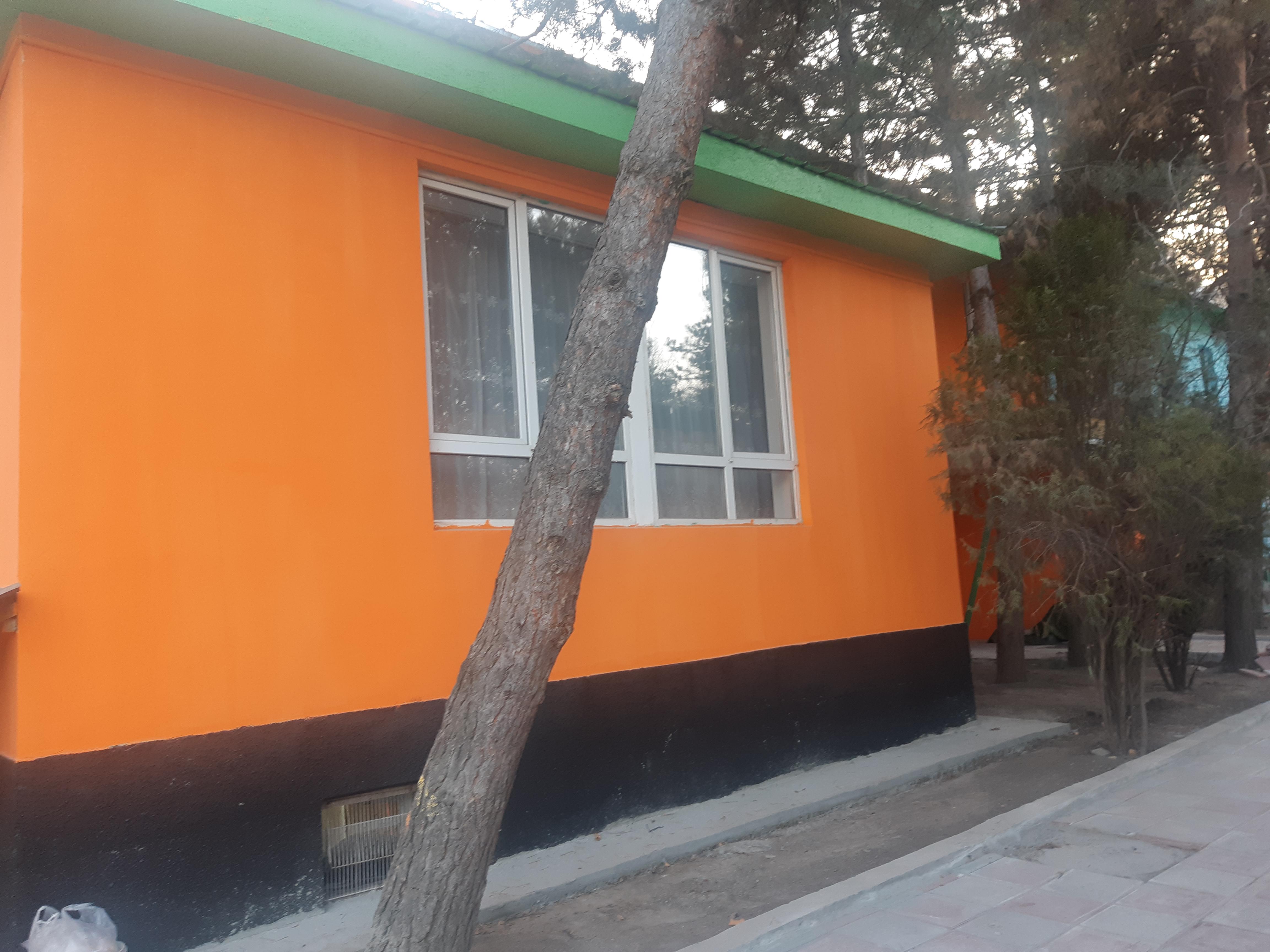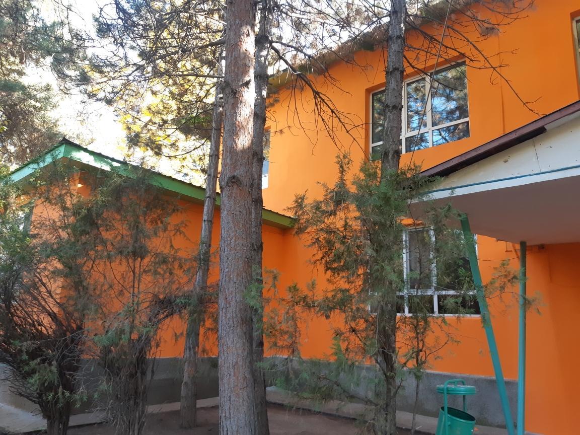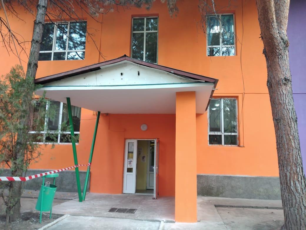 Территория детского сада огорожена решетчатым забором высотой 1 метр и в темное время суток освещается мощными фонарями дневного света.