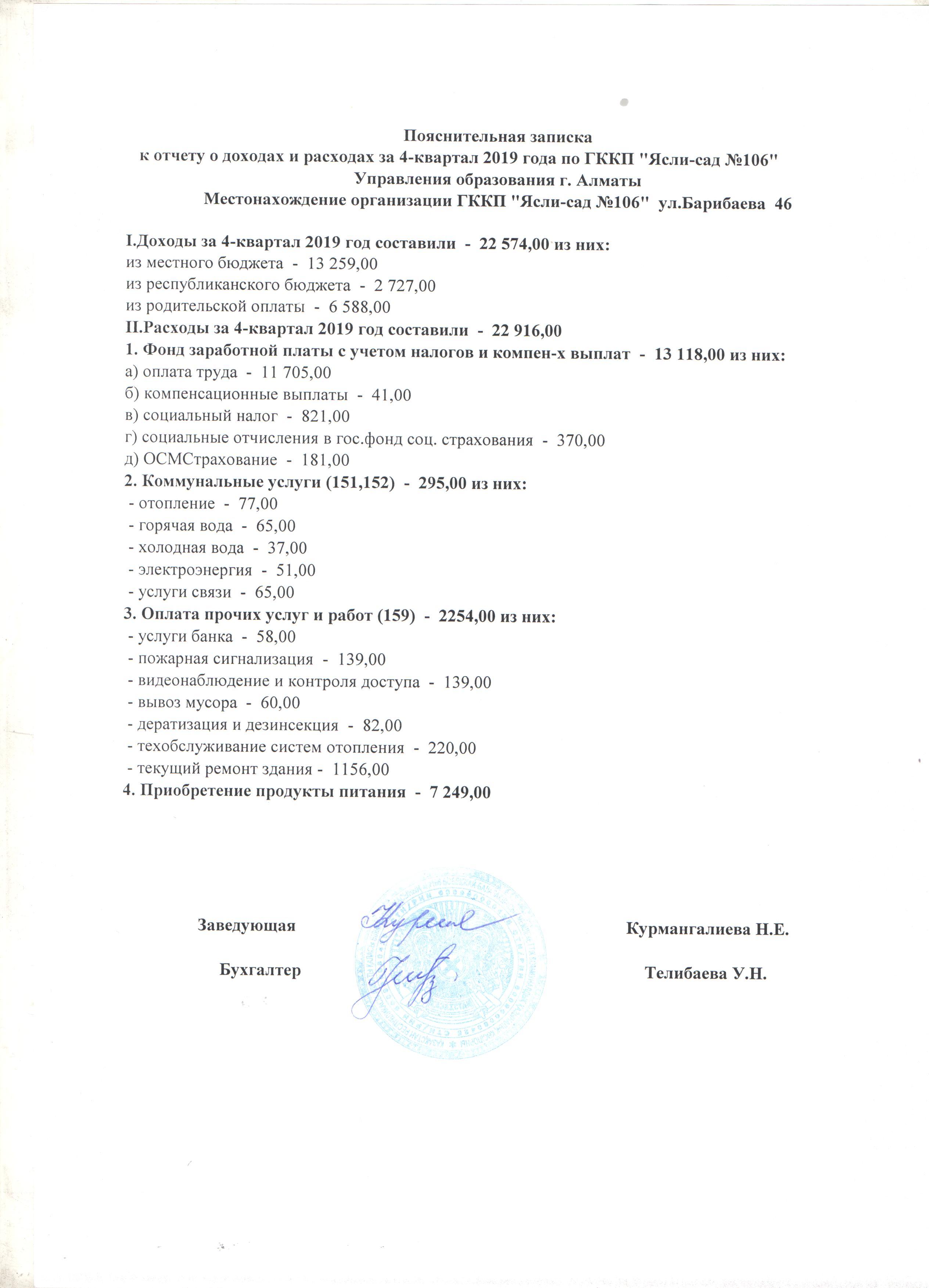 Отчет о доходах и расходах за IV-квартал 2019 год » ГККП "Ясли сад №106"