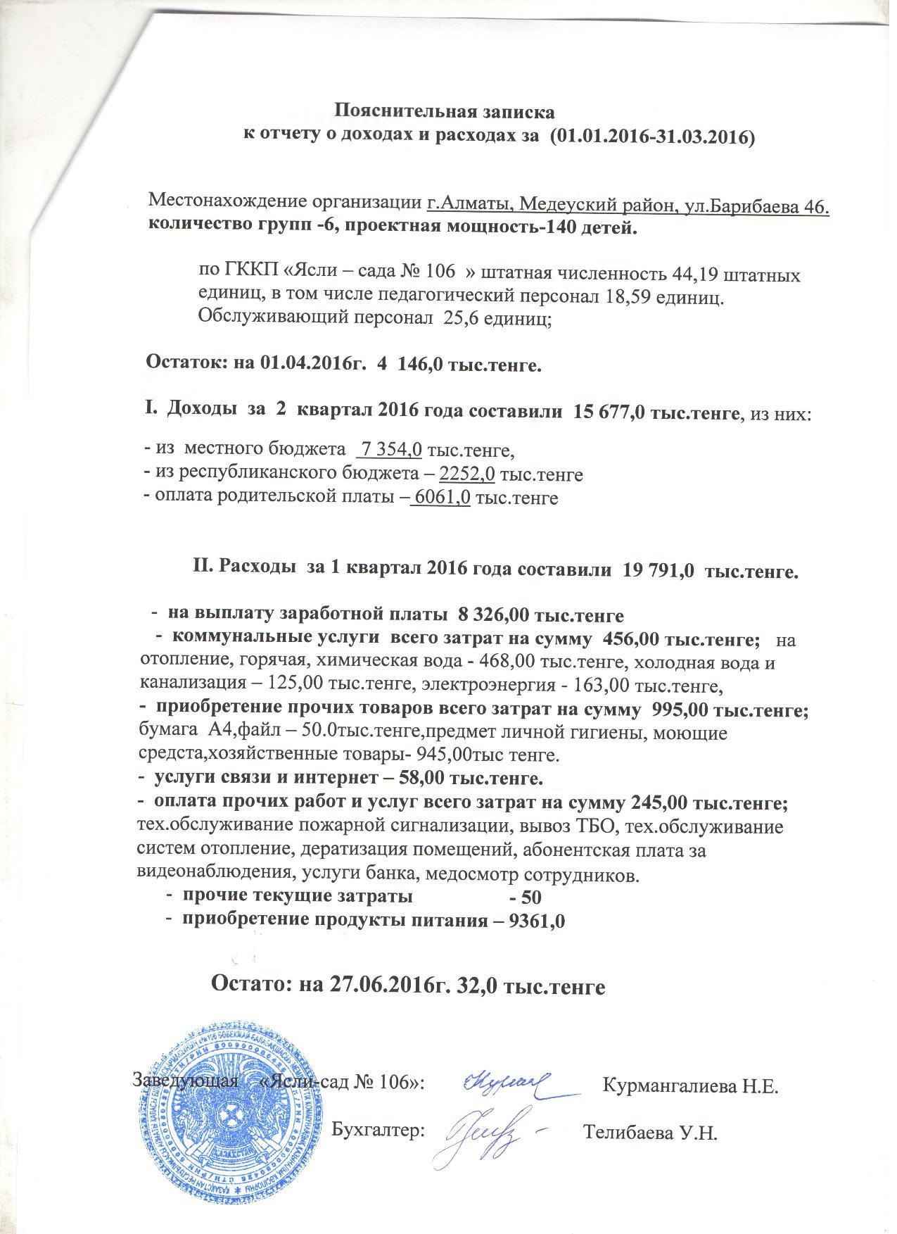 Отчет о доходах и расходах за 3 Квартал 2016 и пояснительная записка » ГККП "Ясли сад №106"