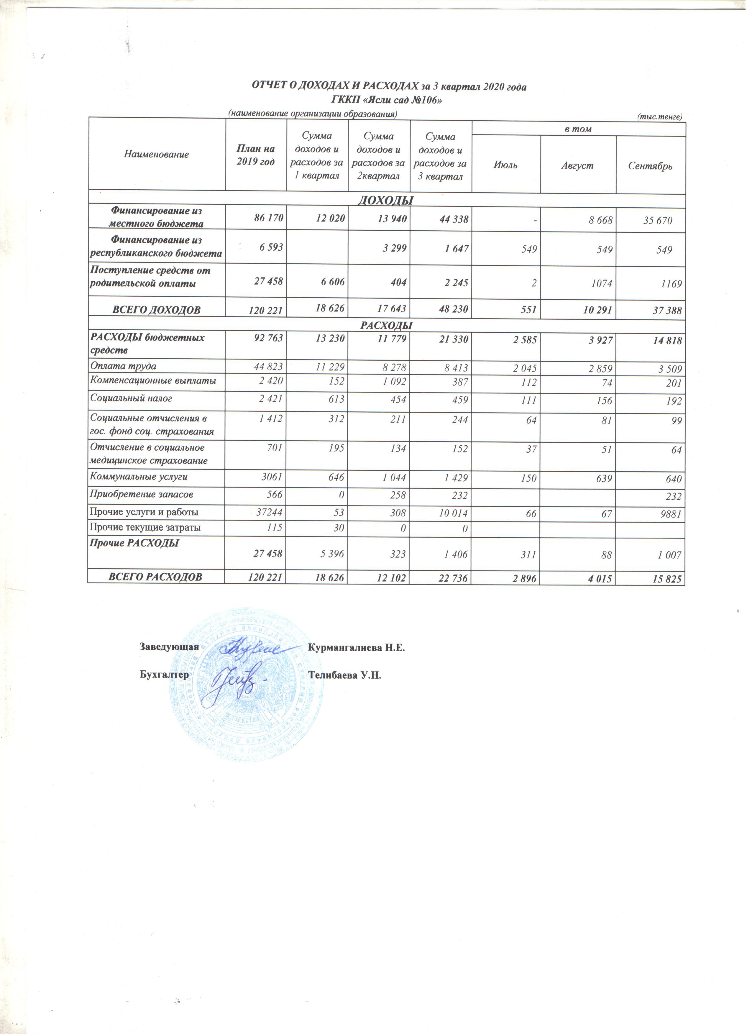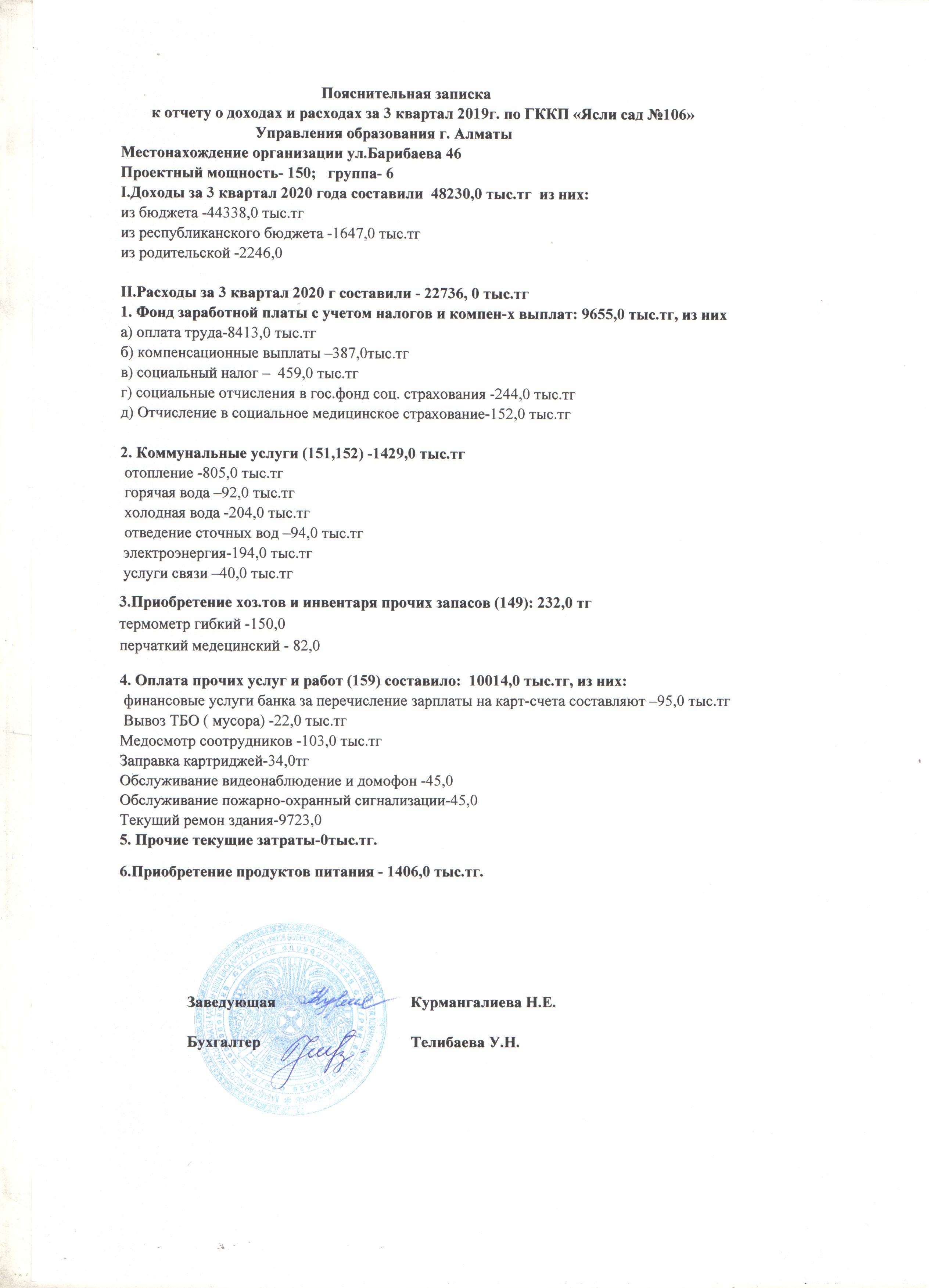 Отчет о доходах и расходах за III-квартал 2020 г » ГККП "Ясли сад №106"