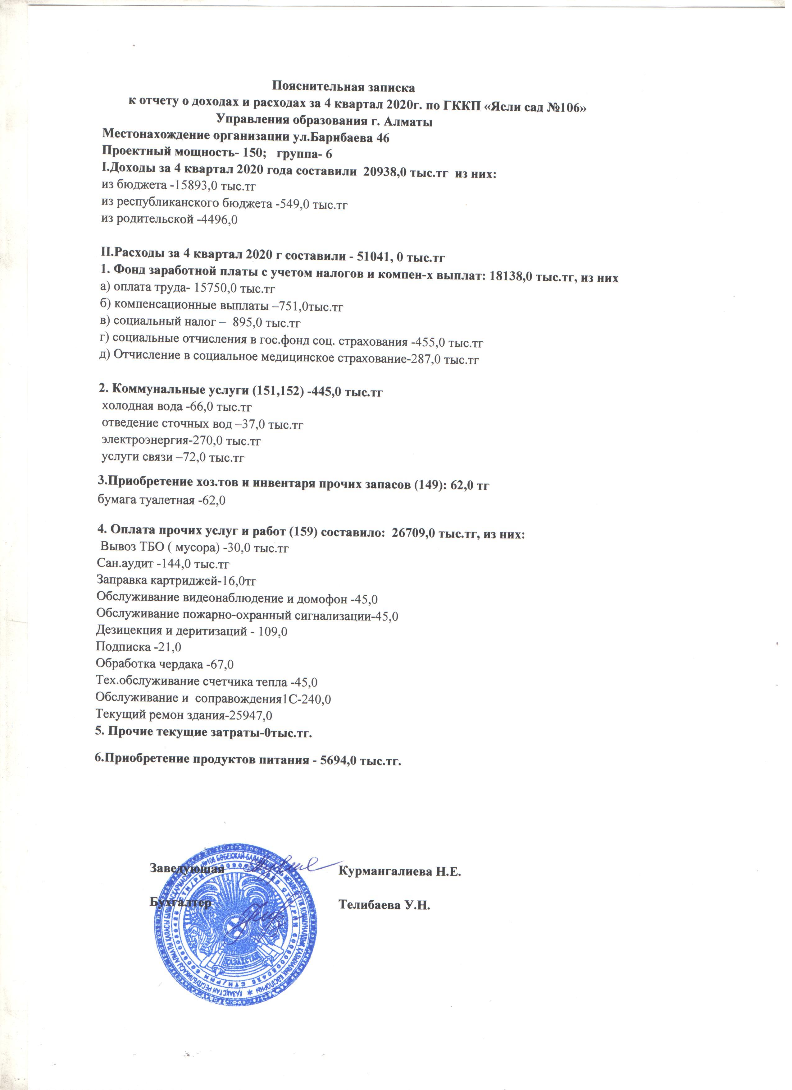 Отчет о доходах и расходах за 4 квартал 2020 год » ГККП "Ясли сад №106"