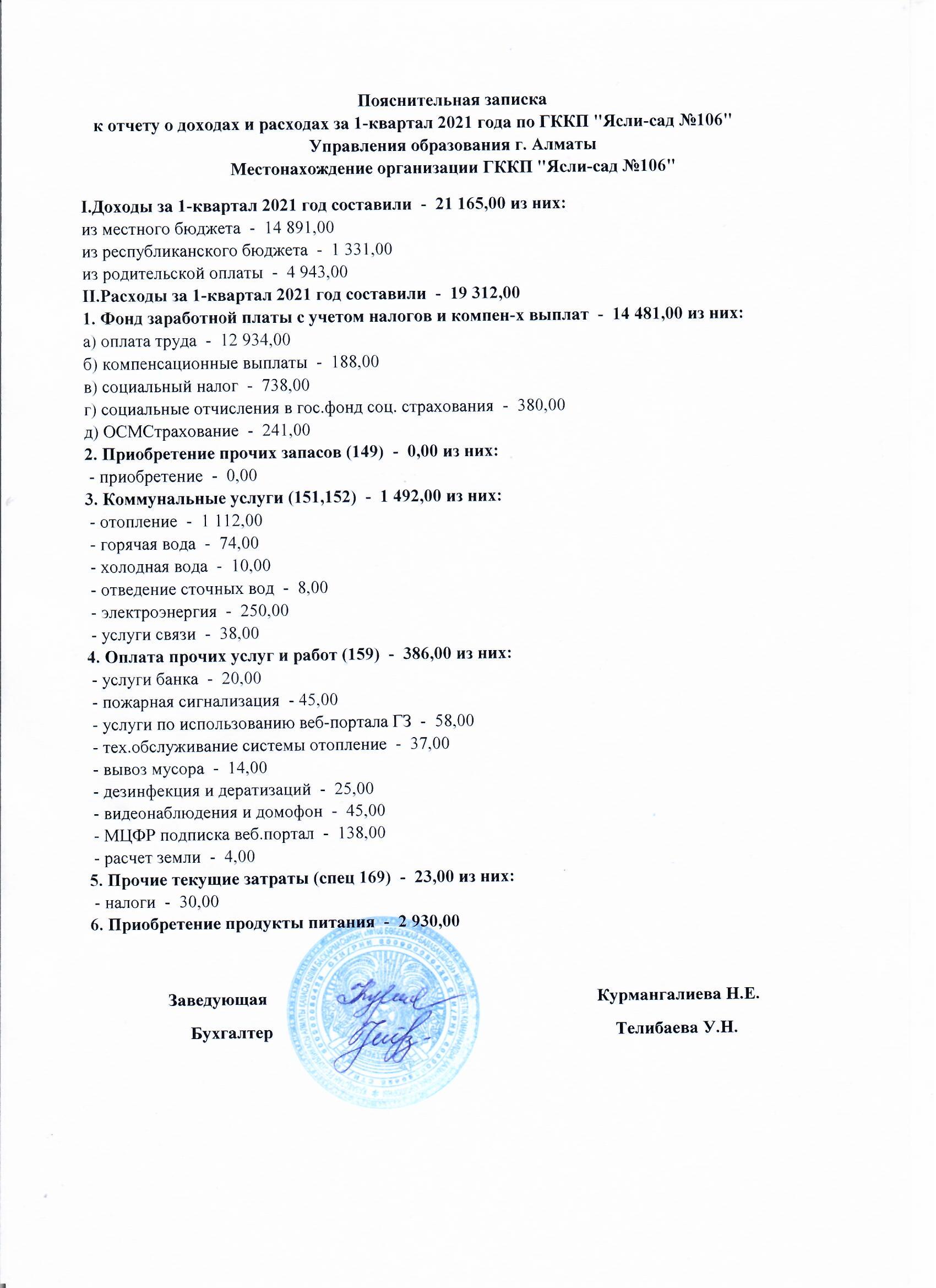 Отчет о доходах и расходах за 1-квартал 2021 г » ГККП "Ясли сад №106"