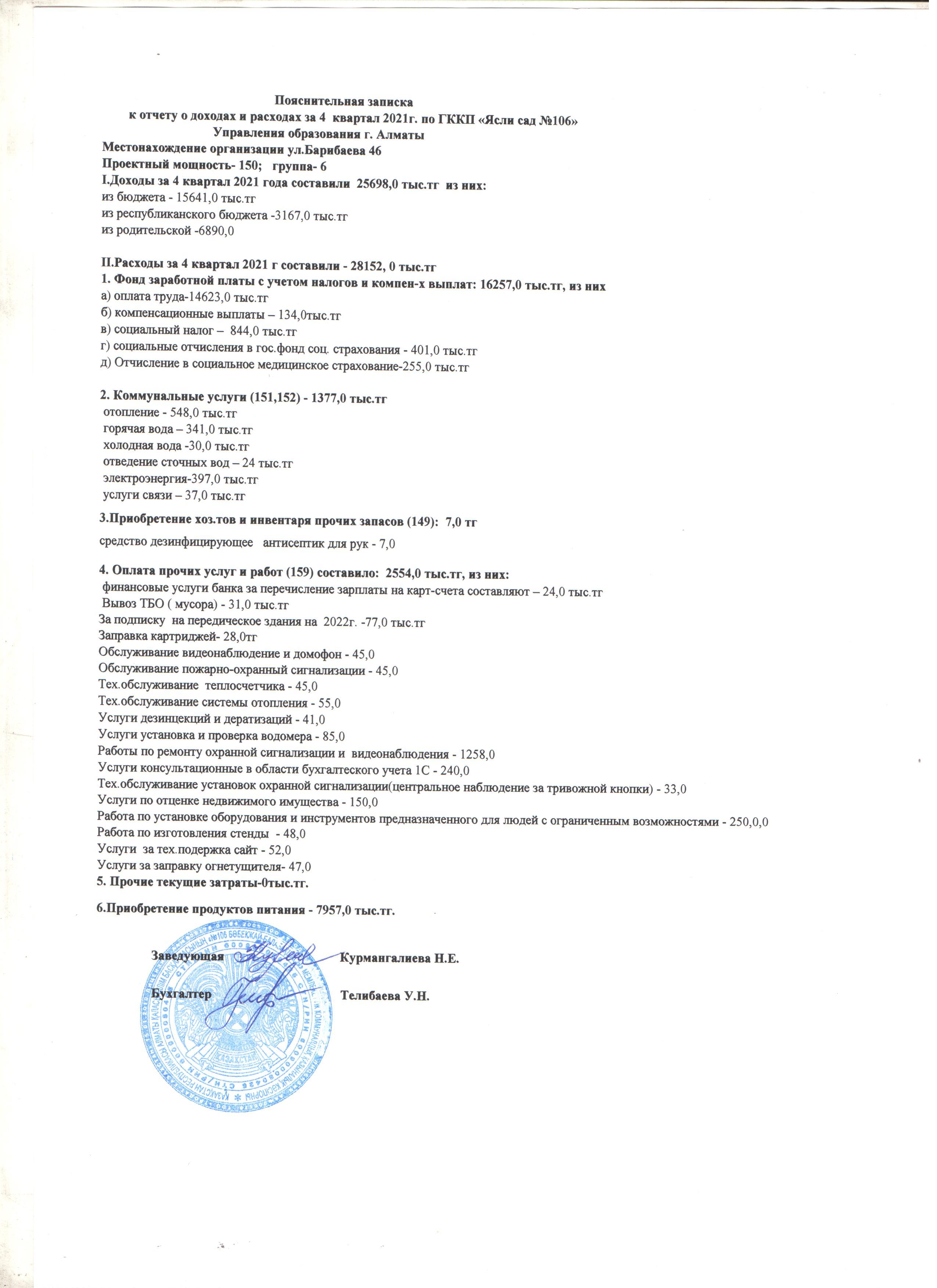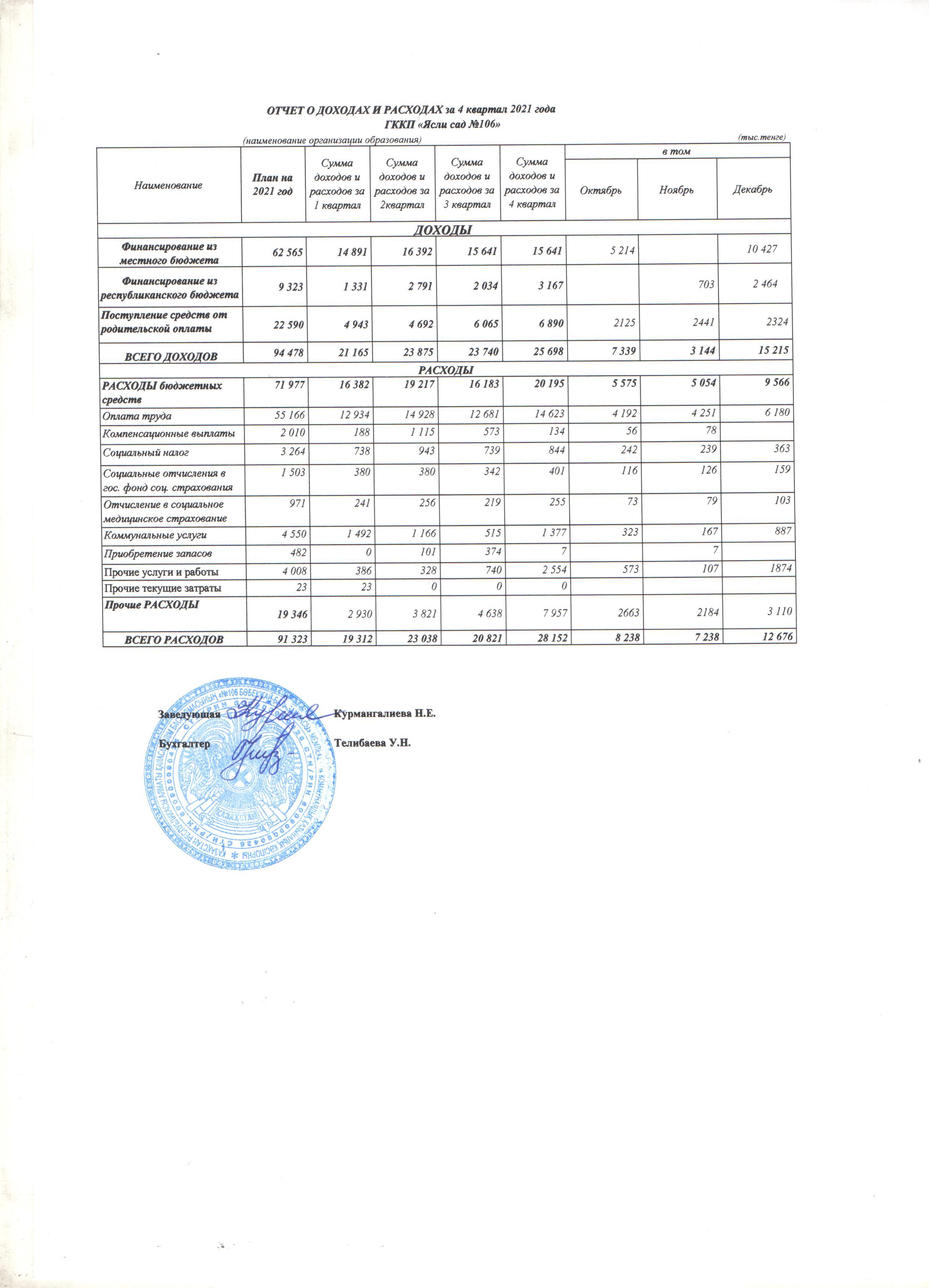Отчет о доходах и расходах за 4-квартал 2021 год » ГККП "Ясли сад №106"
