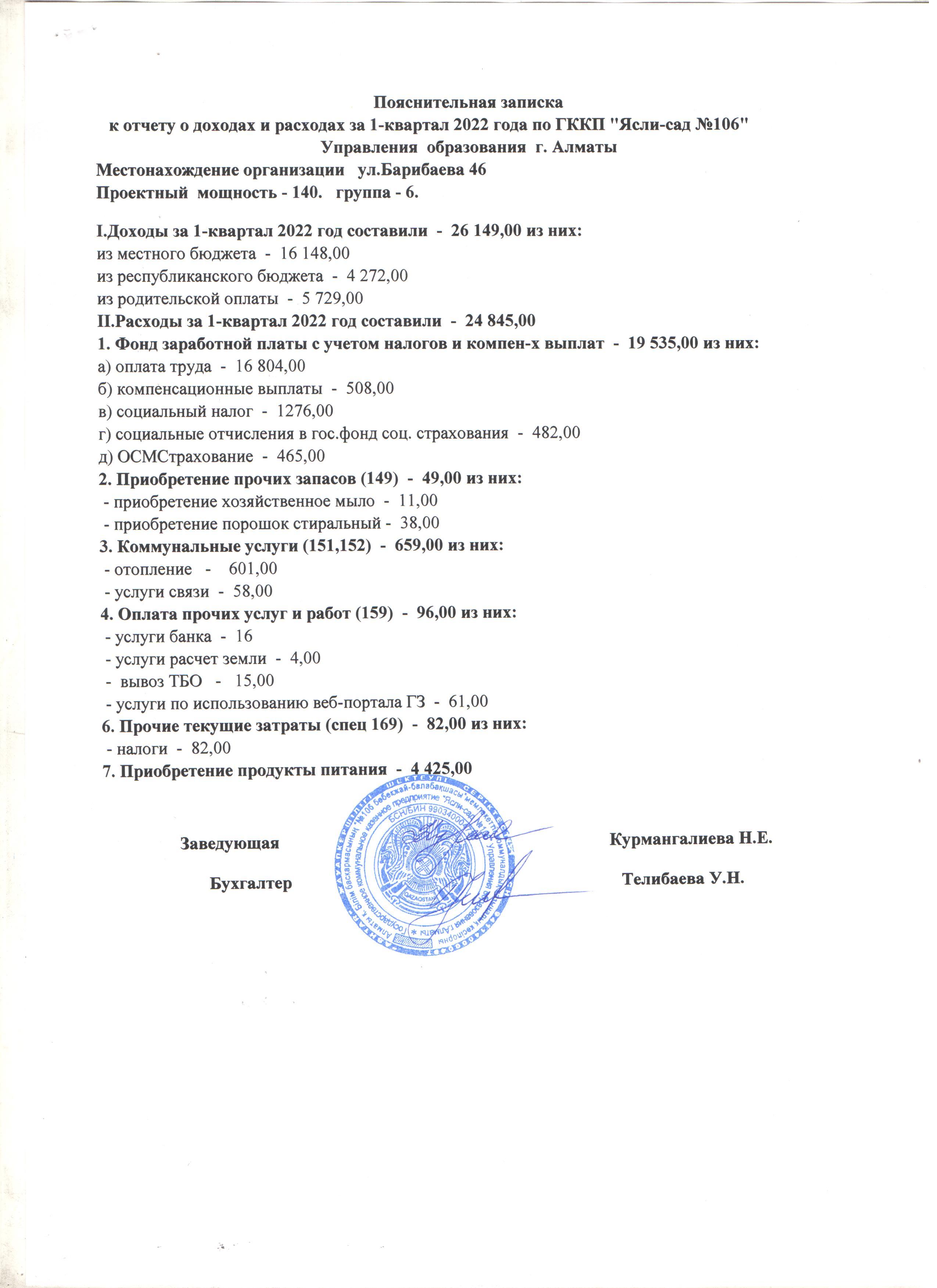Отчет о доходах и расходах за 1-квартал 2022 год » ГККП "Ясли сад №106"