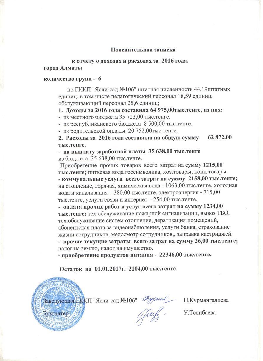 Отчет о доходах и расходах за 2016 и пояснительная записка » ГККП "Ясли сад №106"