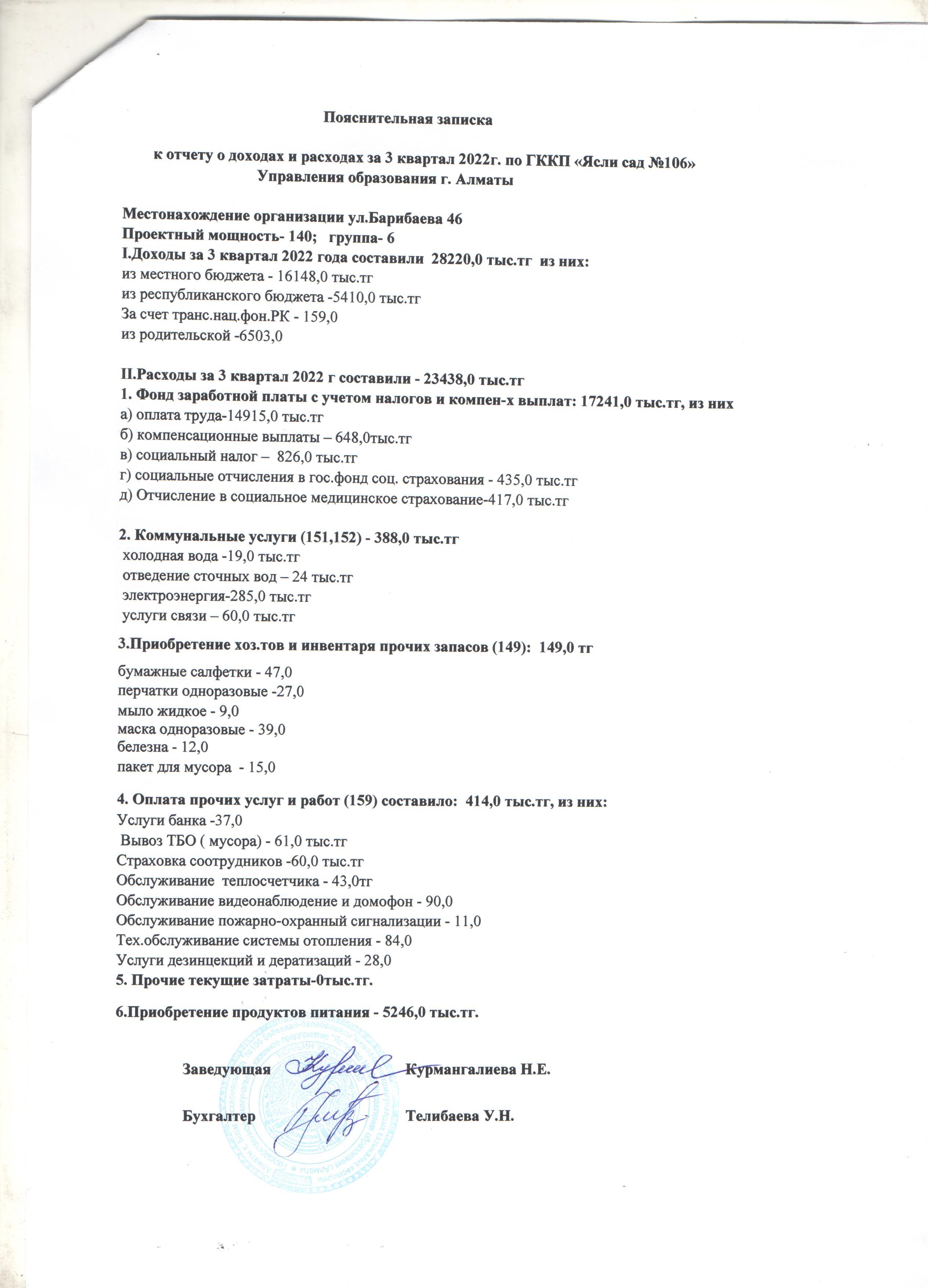 Отчет о доходах и расходах за 3-квартал 2022 год » ГККП "Ясли сад №106"