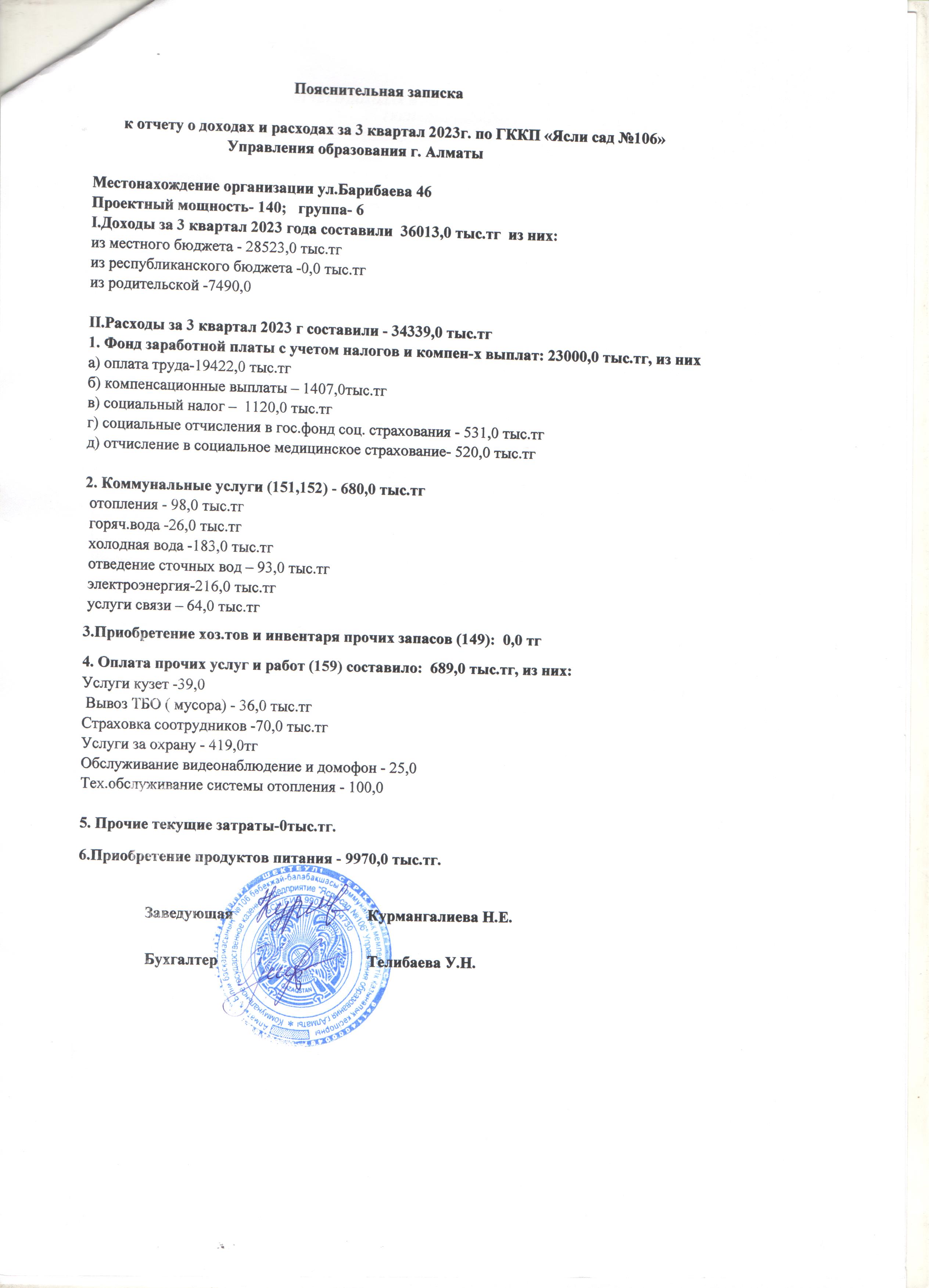 Отчет о доходов и расходах за 3 квартал 2023 года » ГККП "Ясли сад №106"