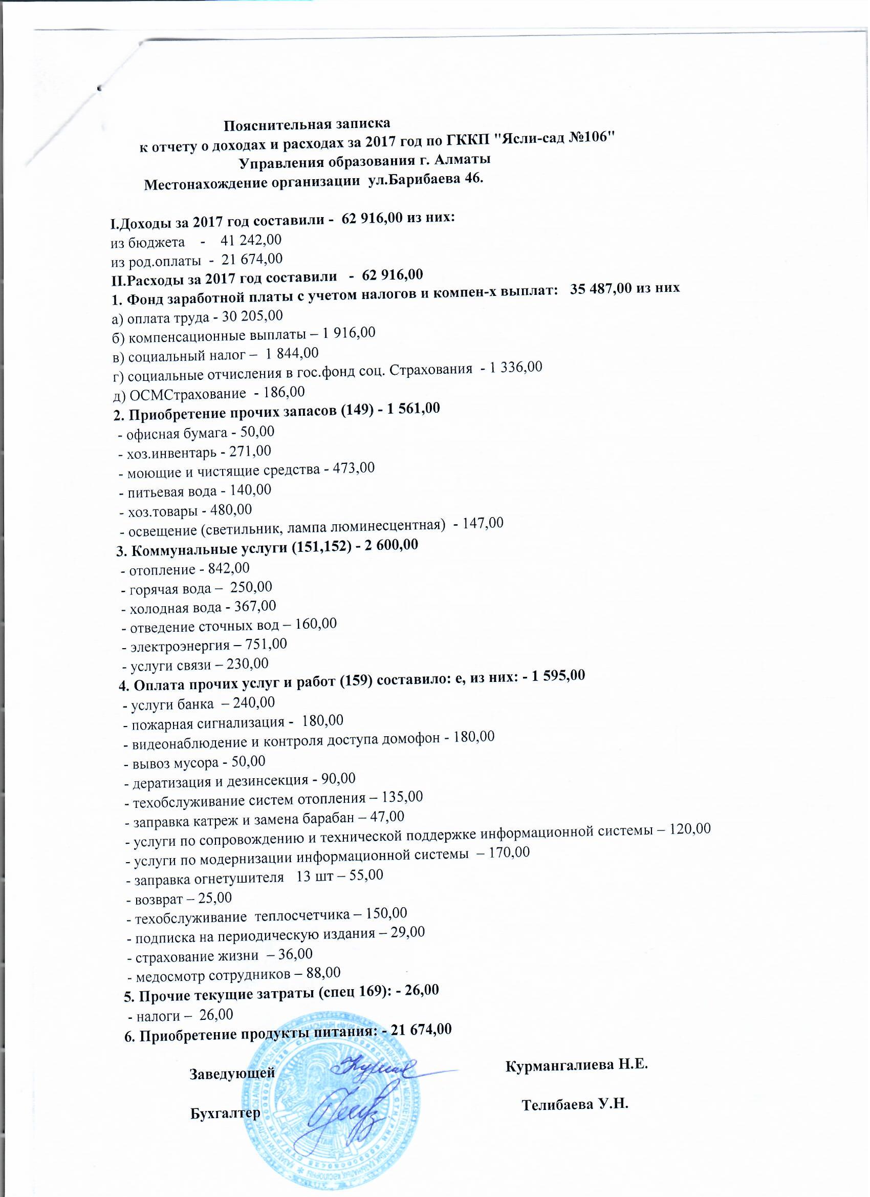 Отчет о доходах и расходах за 2017 год » ГККП "Ясли сад №106"