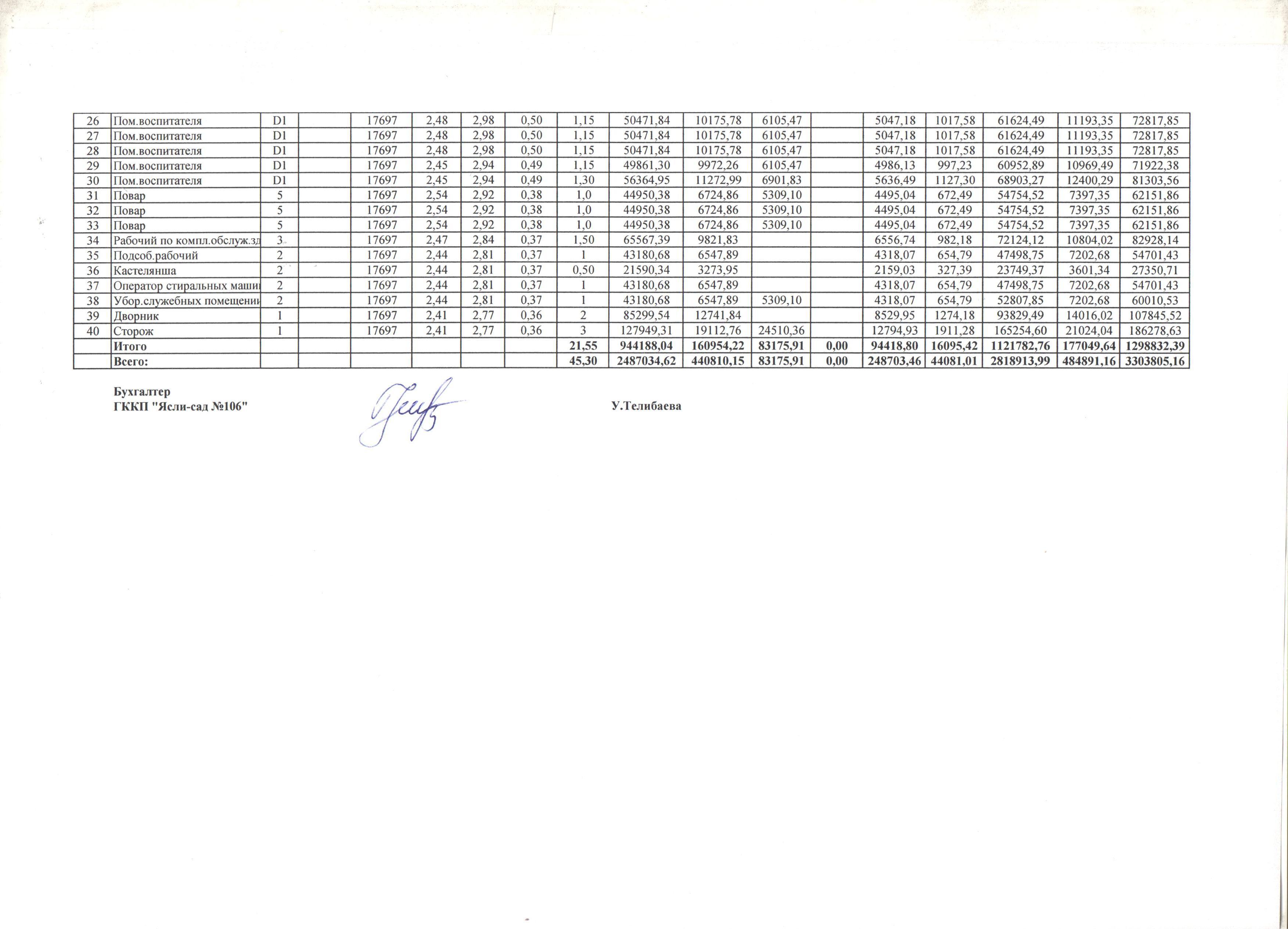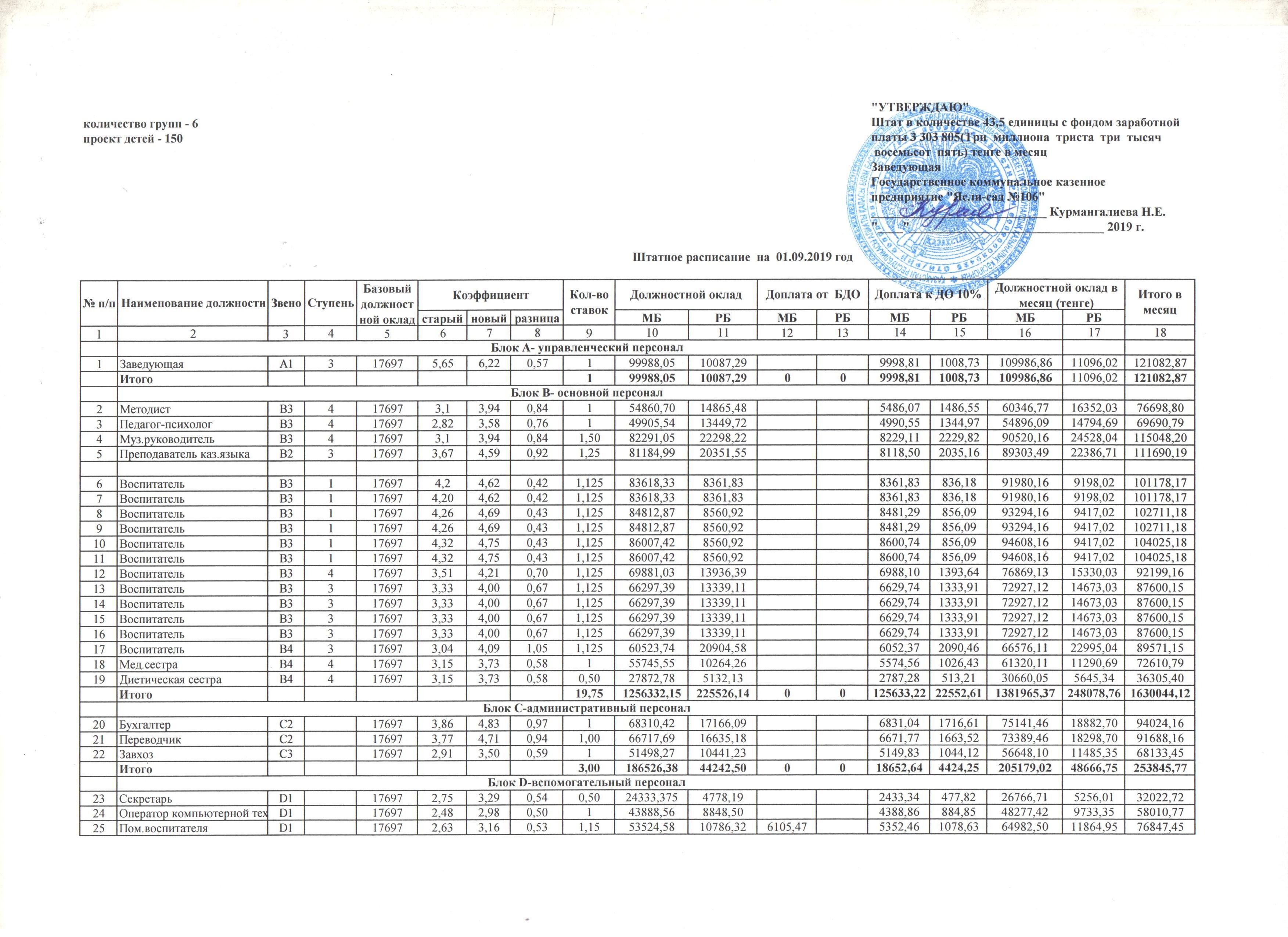 Штатное расписание на 01 сентября 2019 год » ГККП "Ясли сад №106"