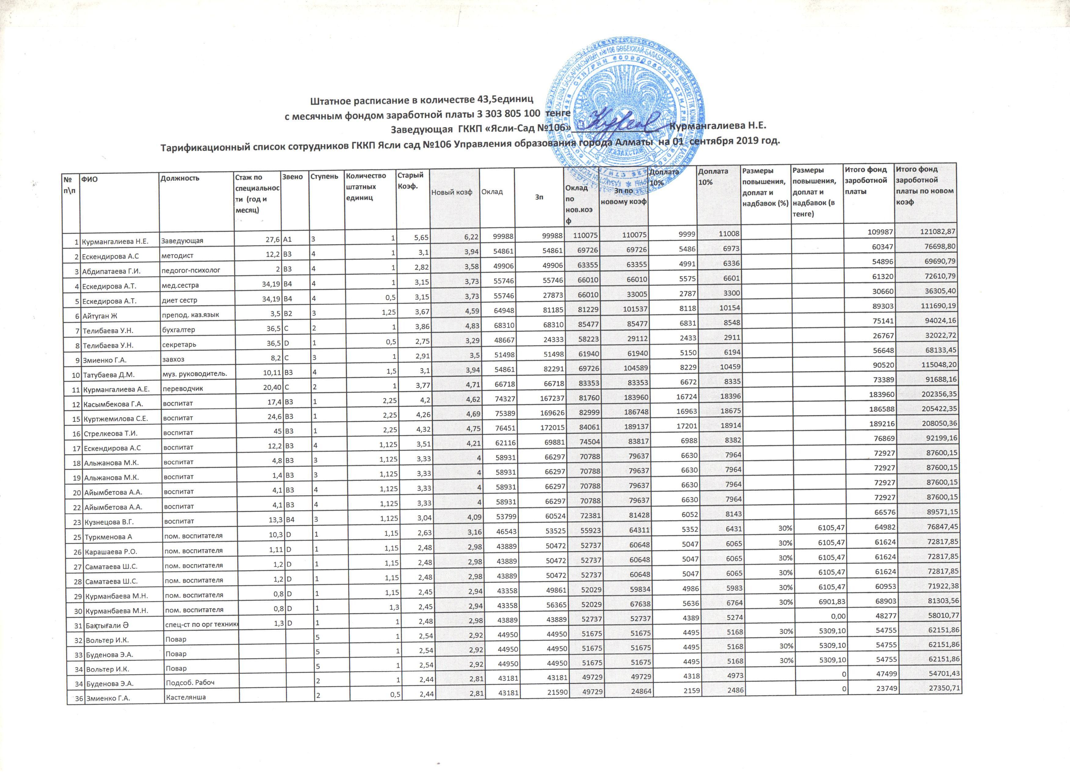 Тарификационный список 2019 г » ГККП "Ясли сад №106"